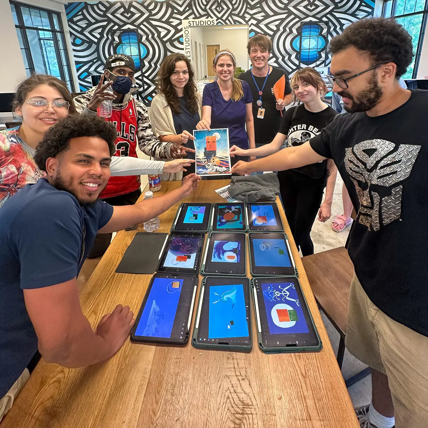 Creators try a telephone-style drawing challenge on the iPads using Procreate.