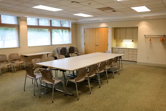 Multipurpose meeting room, includes a kitchenette with a sink, refrigerator, and microwave