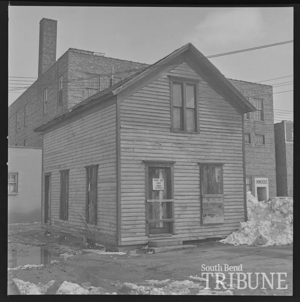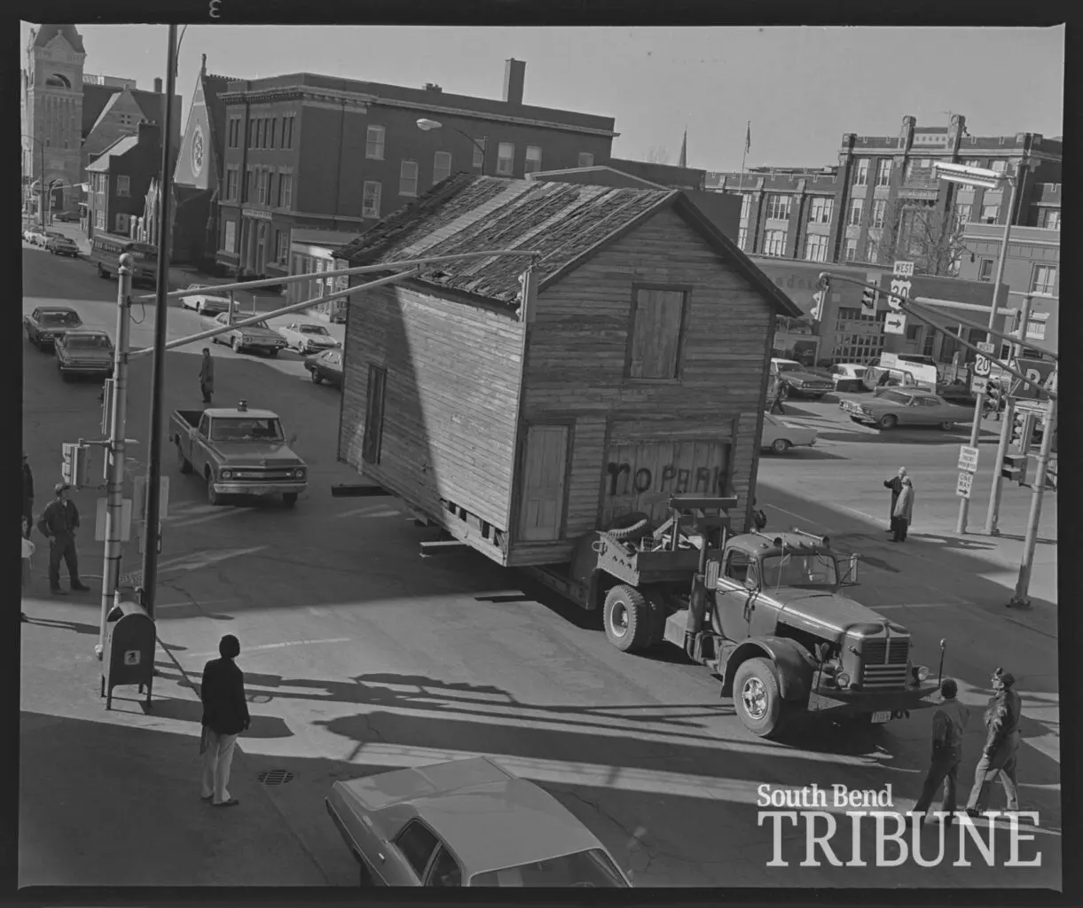 Eventually, the neighborhood began to change and Main Street neighbors relocated. “Our house was the last standing house,” Bryant remarked, “all the other relatives had sold their houses.” The Powell family home later sat vacant in the Innwoods parking lot, a lone structural island in a sea of urban development and asphalt that had sprung up around it. Boarded up windows relegated this prominent South Bend structure to slow disappearance, until 1973 when local high school students took up the cause to preserve it. The home was lifted up on the bed of a trailer and relocated to Leeper Park following the students’ activism, making its way through the city streets as a one-house parade.