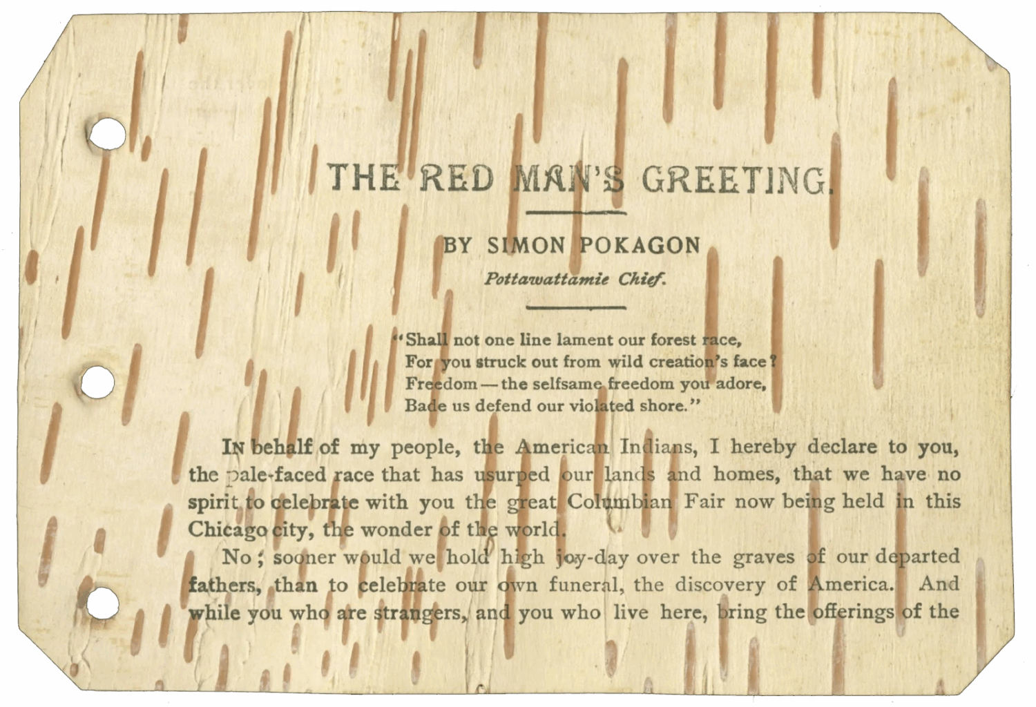 Simon Pokagon and The Red Man’s Rebuke/the red man’s greeting. (n.d.) Beyond the White City. Retrieved November 12, 2025, from https://www.beyondthewhitecity.org/simon-pokagon-rebuke