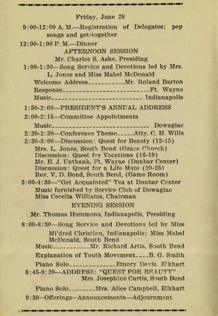 Some sessions took place at Olivet AME Church. Includes presentations by Charles Ashe, C.H. Wills, B.G. Smith, J. Chester Allen, and others. Among the activities were speeches, discussions, and music. Topics included business, spiritual growth, health, and knowledge. Participants were from South Bend and the local region including Elkhart, Dowagiac, and Fort Wayne. | ca. 1935