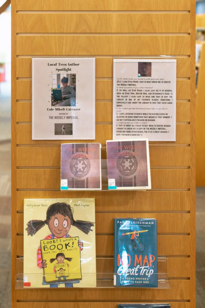 Cole has also curated a Star Wars display at Centre Branch for Star Wars Day, contributing his collection of Star Wars ships, figures, and books to the display case. He is working on a second edition of the magazine, and a zine club is in the works for this summer at the Library!