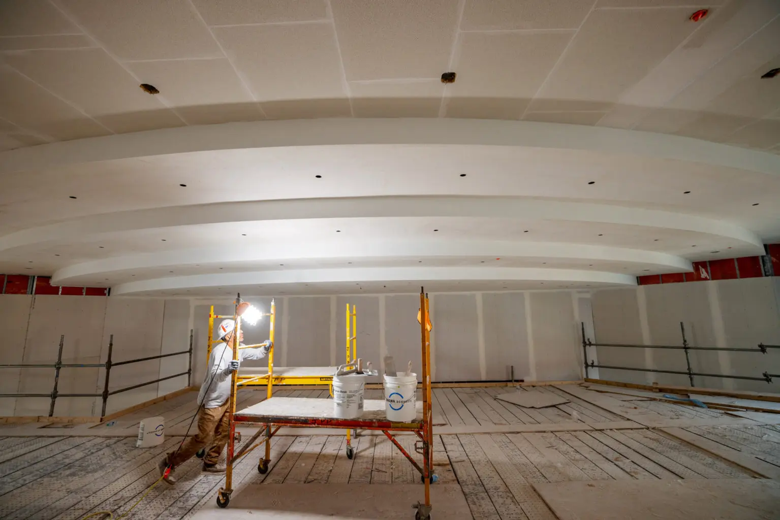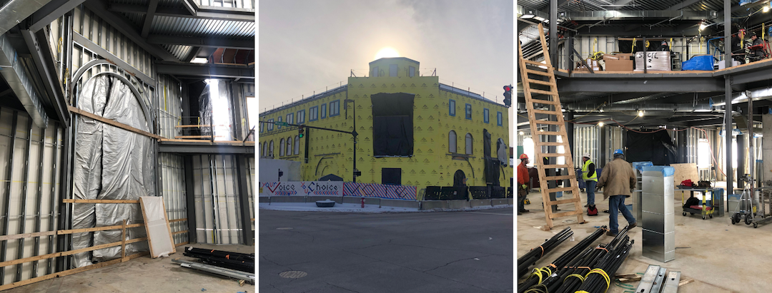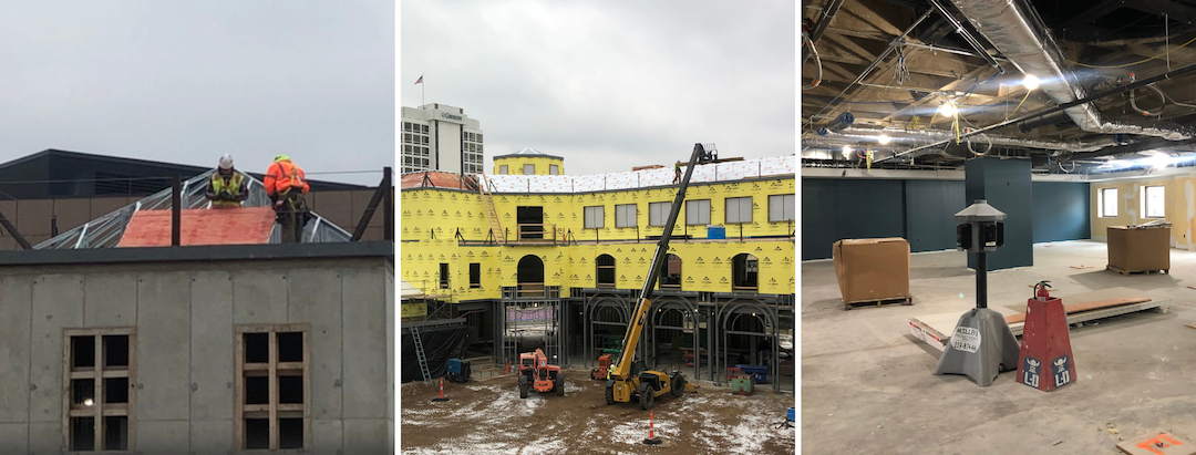 Crews begin work on the interior of the Community Learning Center, which has been insulated with DensGlass and plastic sheeting.