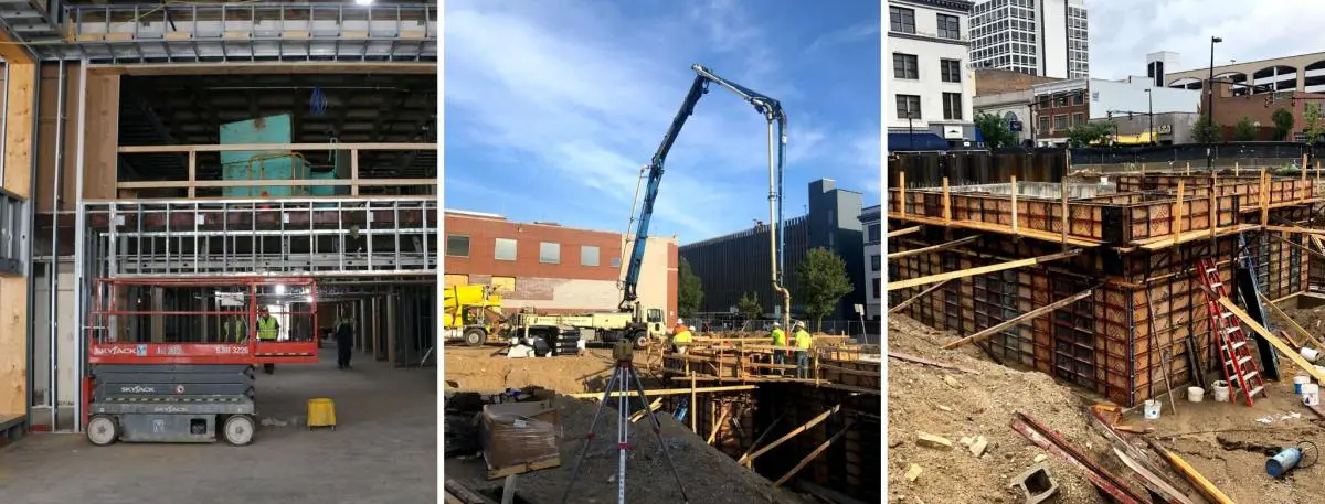 Steel is erected for interior walls and concrete is pumped for exterior walls.