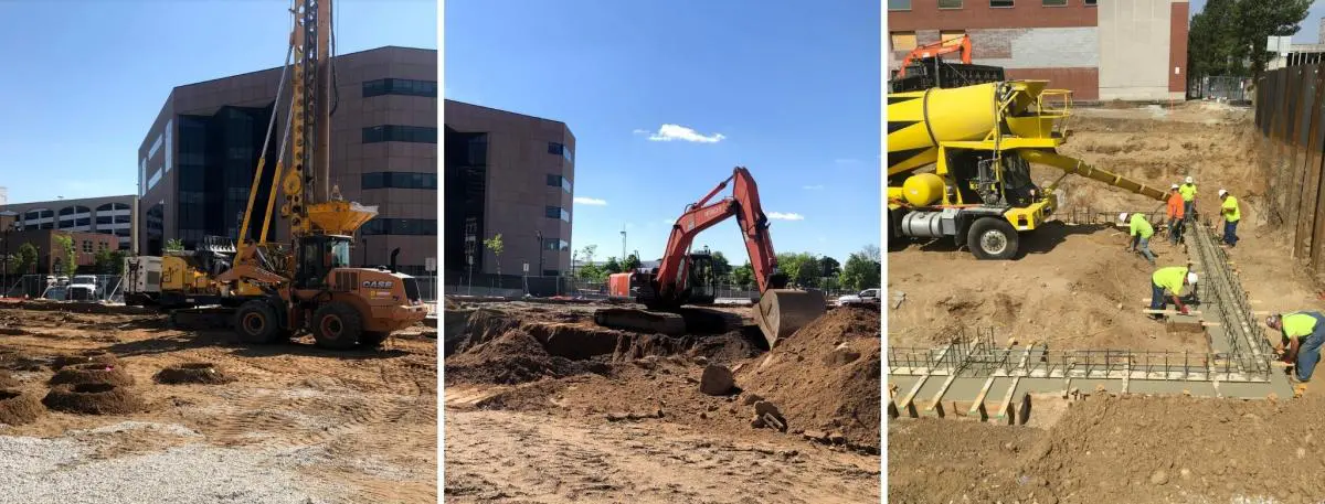 Geo piers are installed, soil is excavated, and concrete is poured for the foundation of the Community Learning Center.