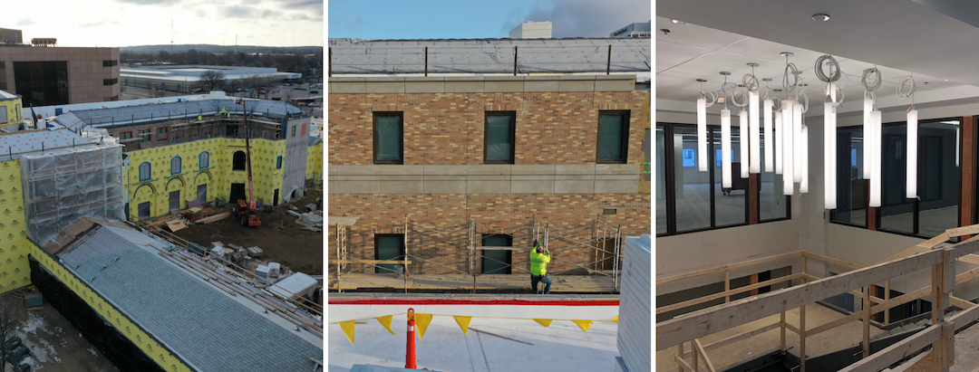 Interior drywall installation begins, exterior corridors are constructed, and elevator shafts for the Community Learning Center are completed.