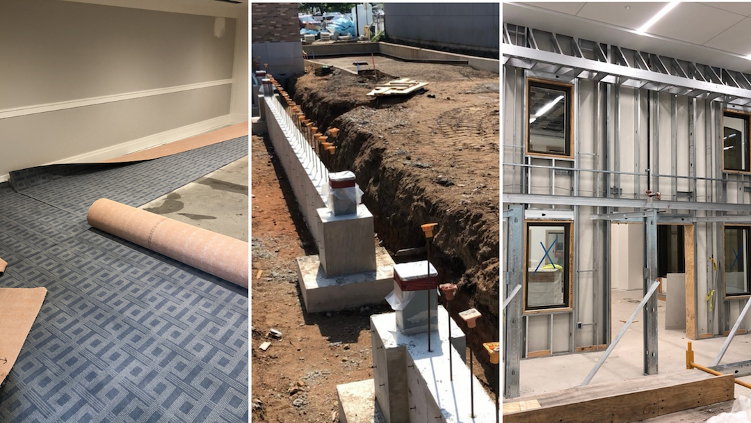 Carpeting begins inside Main Library and a site wall is poured around the Community Learning Center and courtyard.