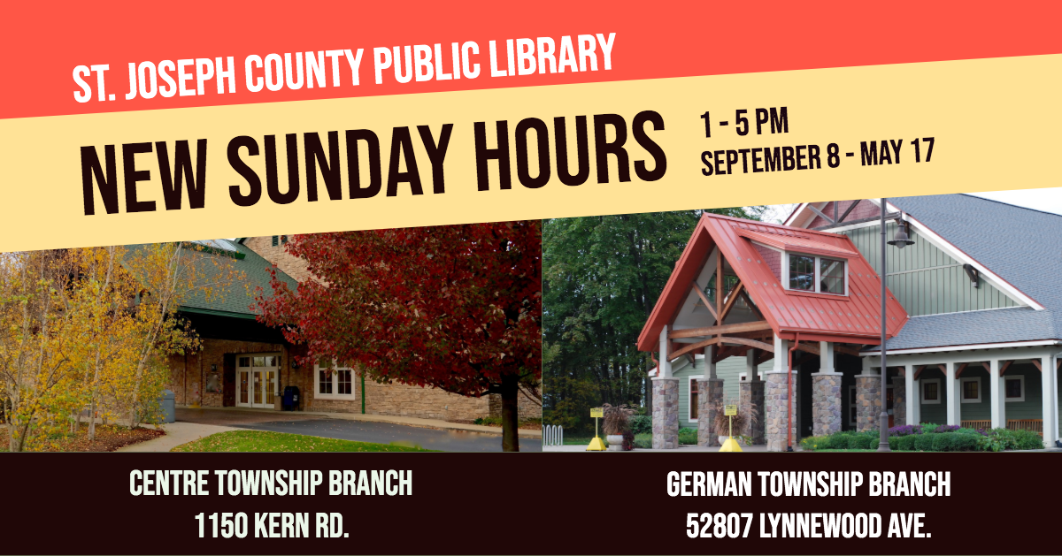 The St. Joseph County Public Library board approves temporary hours beginning fall 2019. Beginning September 8, German Township and Centre Township Branches will be open from 1pm–5pm on Sundays. Beginning in November, Francis Branch and Centre Township Branch will be open from 10am–8pm Monday through Thursday.