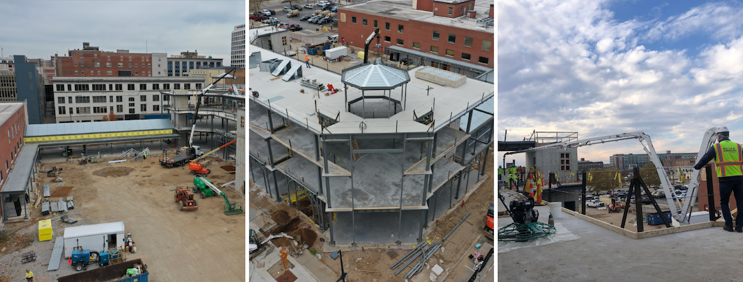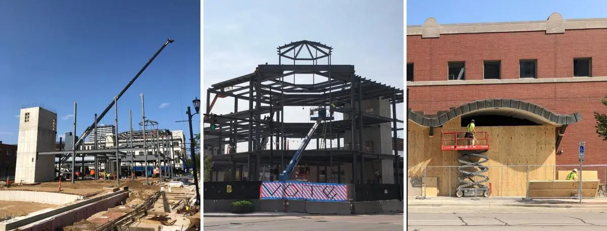 Steel is erected for the Community Learning Center and bubble glass is removed from Main Library.