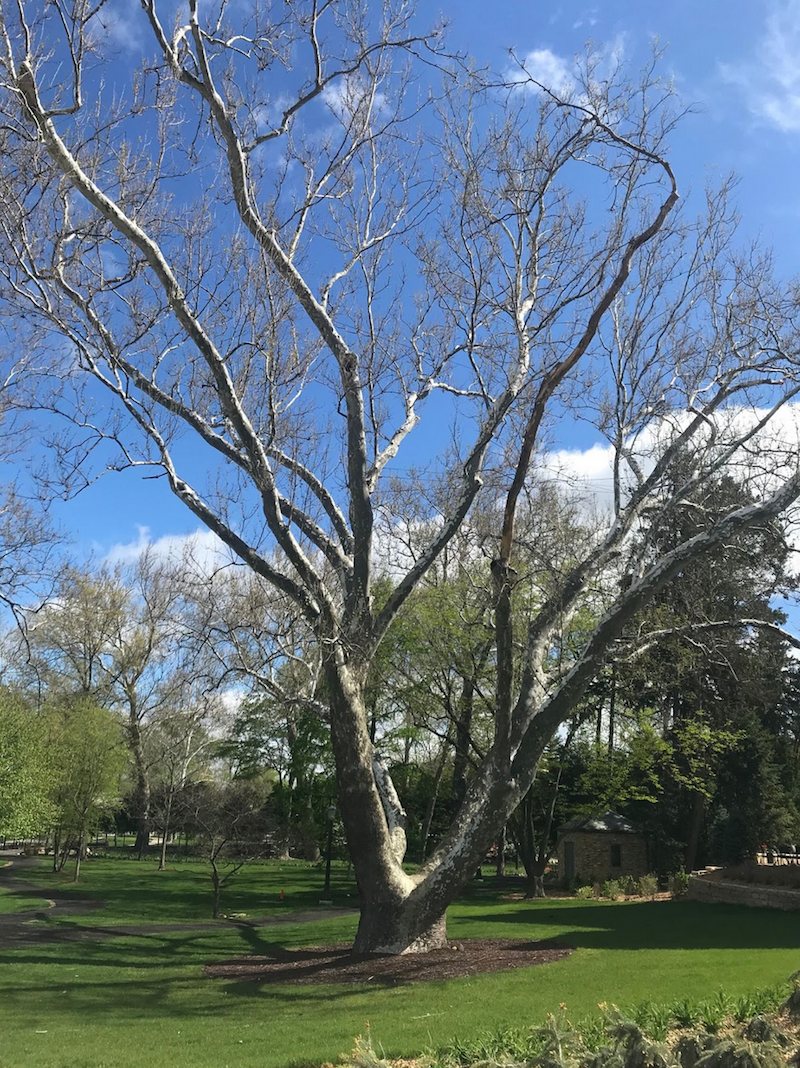 The big Sycamore tree pictured is at the University of Notre Dame, at the intersection of Corby and Holy Cross, and is on the big tree list for St. Joseph County. It is 73 feet tall, and at 4 ½ feet, its massive circumference is 256.5 inches (21.4 feet). The average crown spread is 124.25 feet.